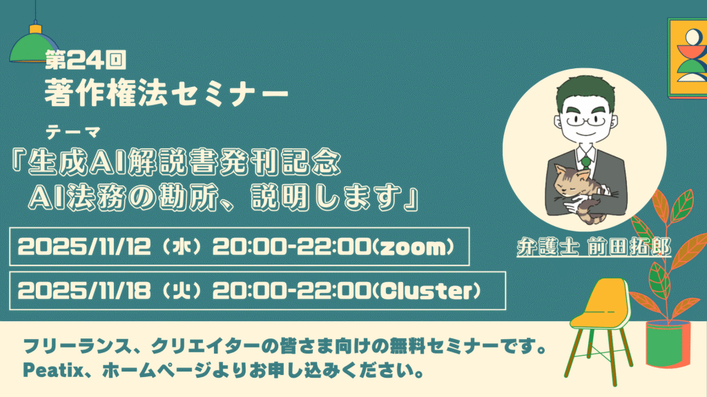 著作権法セミナーは、毎月1回テーマを決めて著作権や法務問題、法務知識について、弁護士が直接クリエイターやフリーランス、事業者のみなさまに向けて解説するセミナーです。